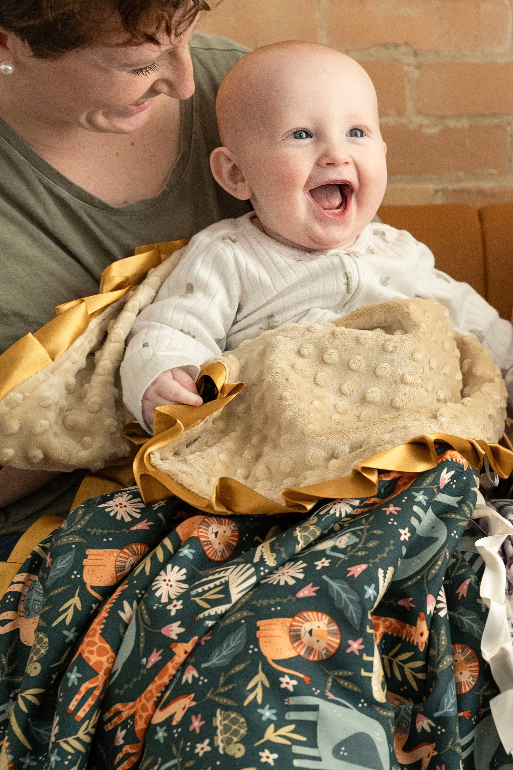 45" x 45" Cotton on Minky fabric with a Satin Ribbon edge