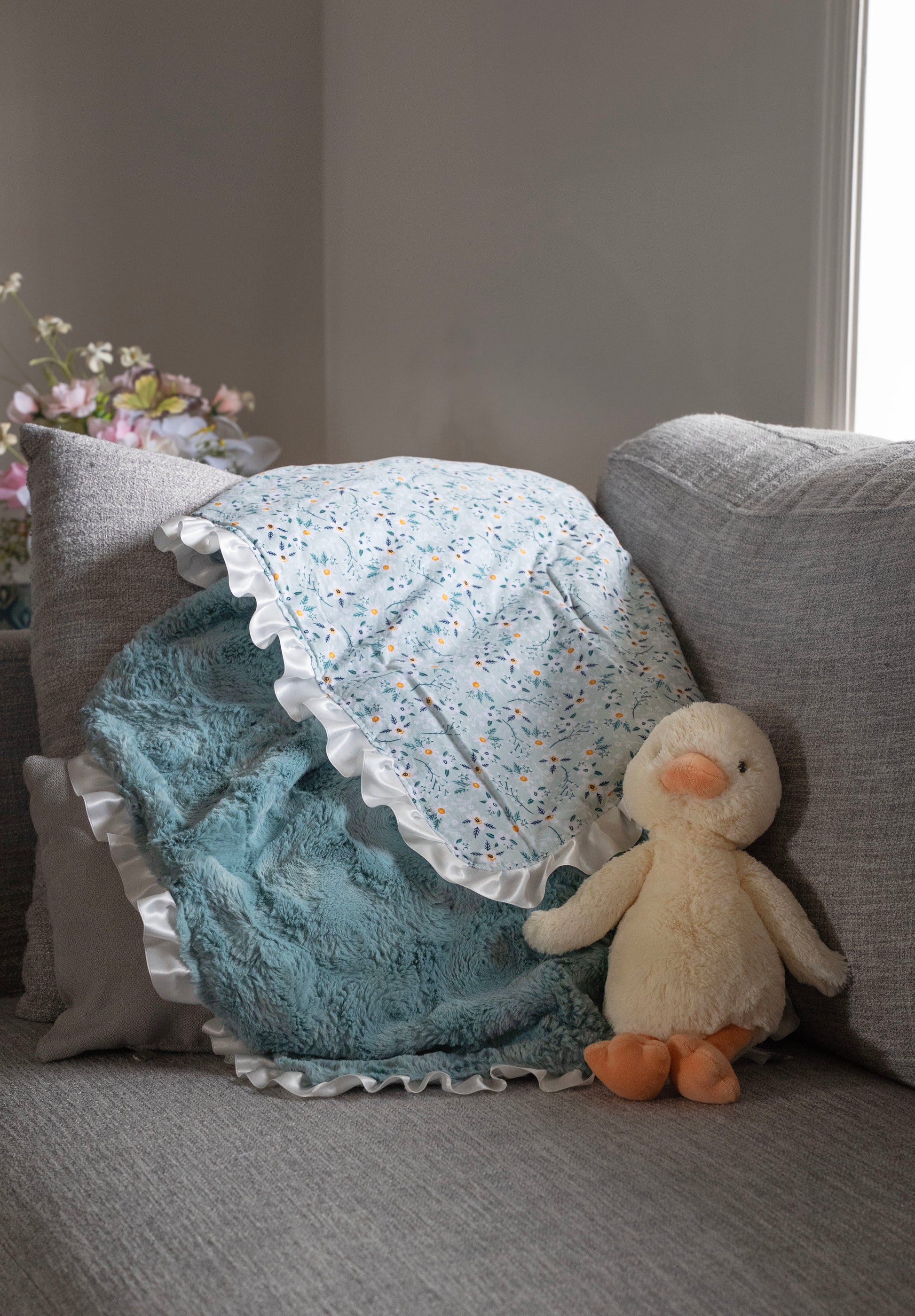45" x 45" Cotton on Minky fabric with a Satin Ribbon edge